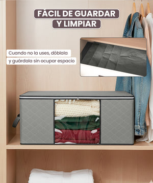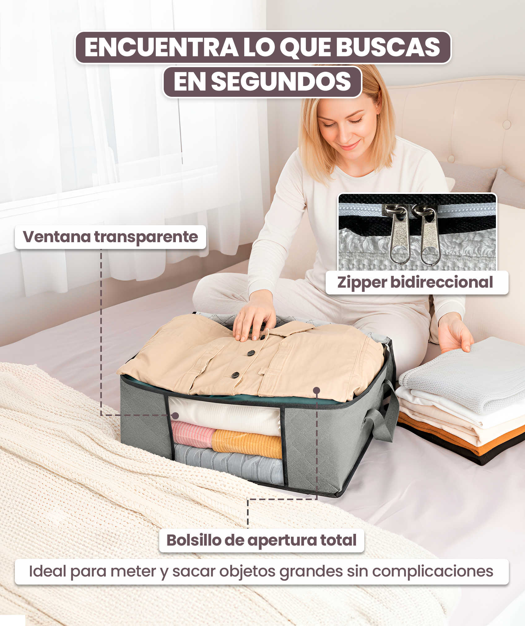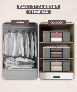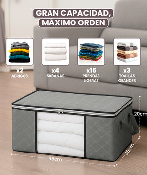 Cada bolsa mide 48 x 36 x 20 cm y tiene una capacidad de 35 litros, lo que brinda un amplio espacio para guardar ropa, abrigos, edredones, toallas, ¡y mucho más! Además, cuentan con asas reforzadas de doble capa que facilitan el transporte.
