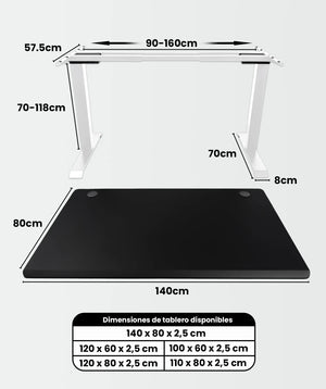 El escritorio de acero aleado permite ajustar la altura desde 72 cm hasta 121 cm; y regular el ancho de 90 cm a 140 cm, proporcionando un espacio generoso y ergonómico para cualquier silla de oficina. A su vez, el tablero de MDF está disponible en las siguientes medidas: