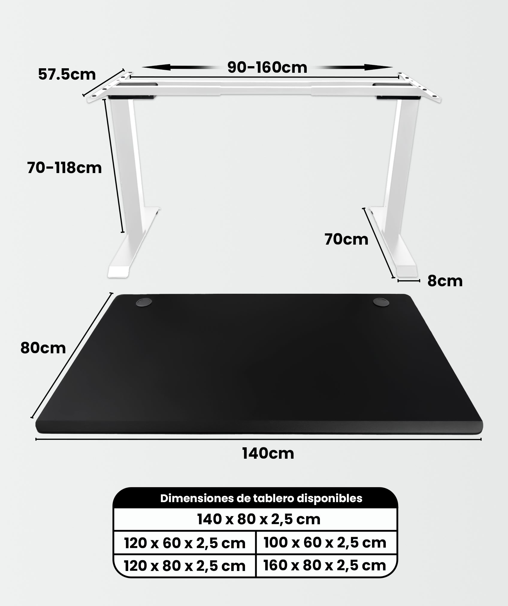 Con nuestro escritorio de última generación, puedes adaptar las dimensiones a tu gusto. Ajusta la altura de 70 cm a 118 cm y el ancho de 90 cm a 160 cm. ¡Crea el espacio de trabajo ergonómico que necesitas, sin importar tu silla de oficina!