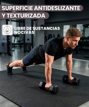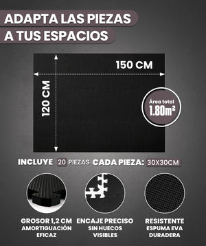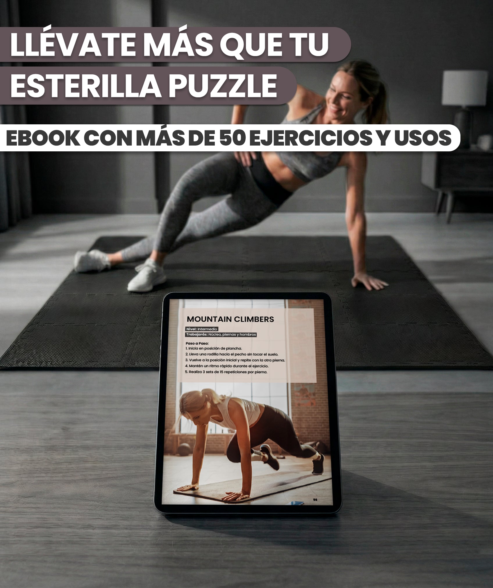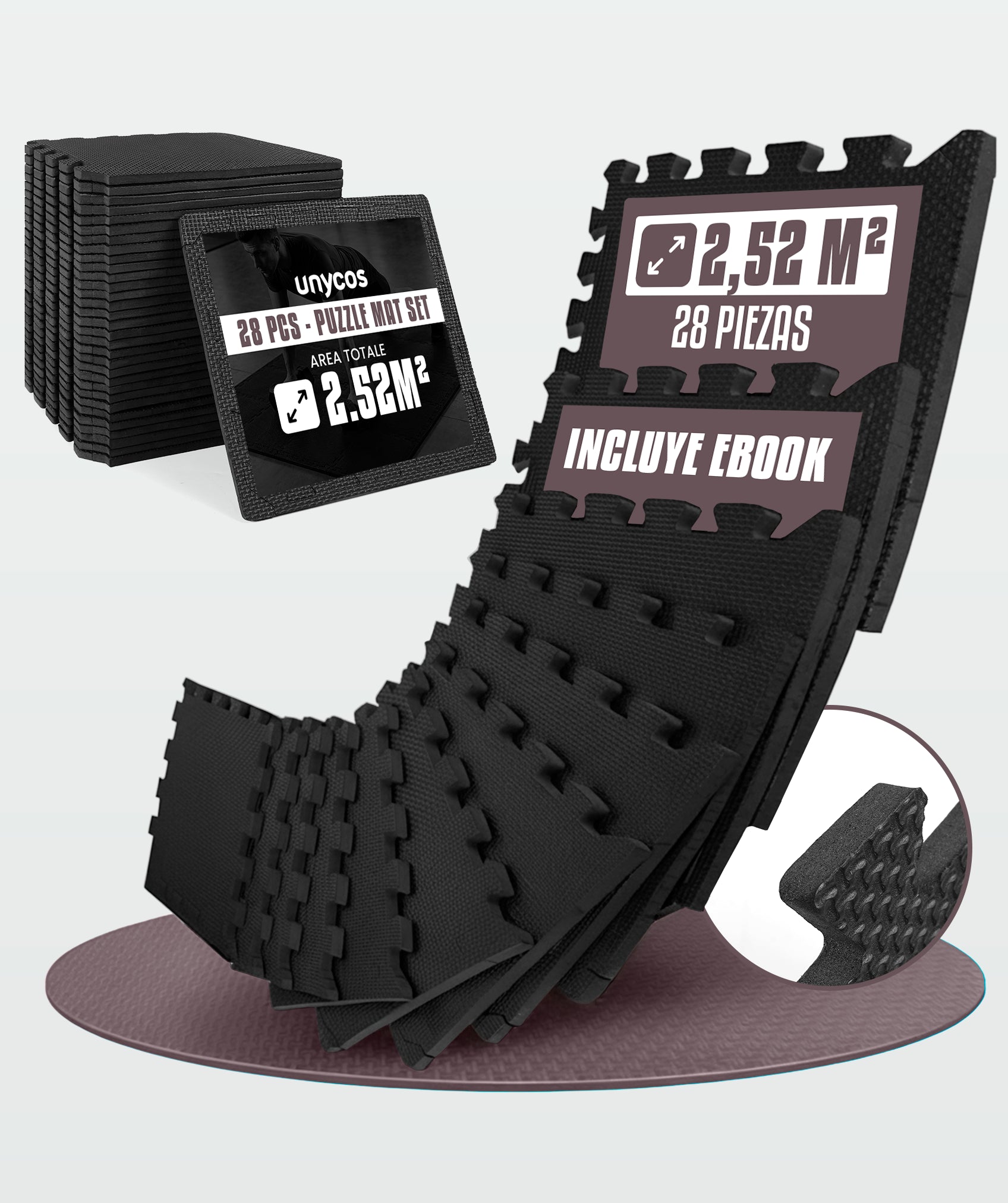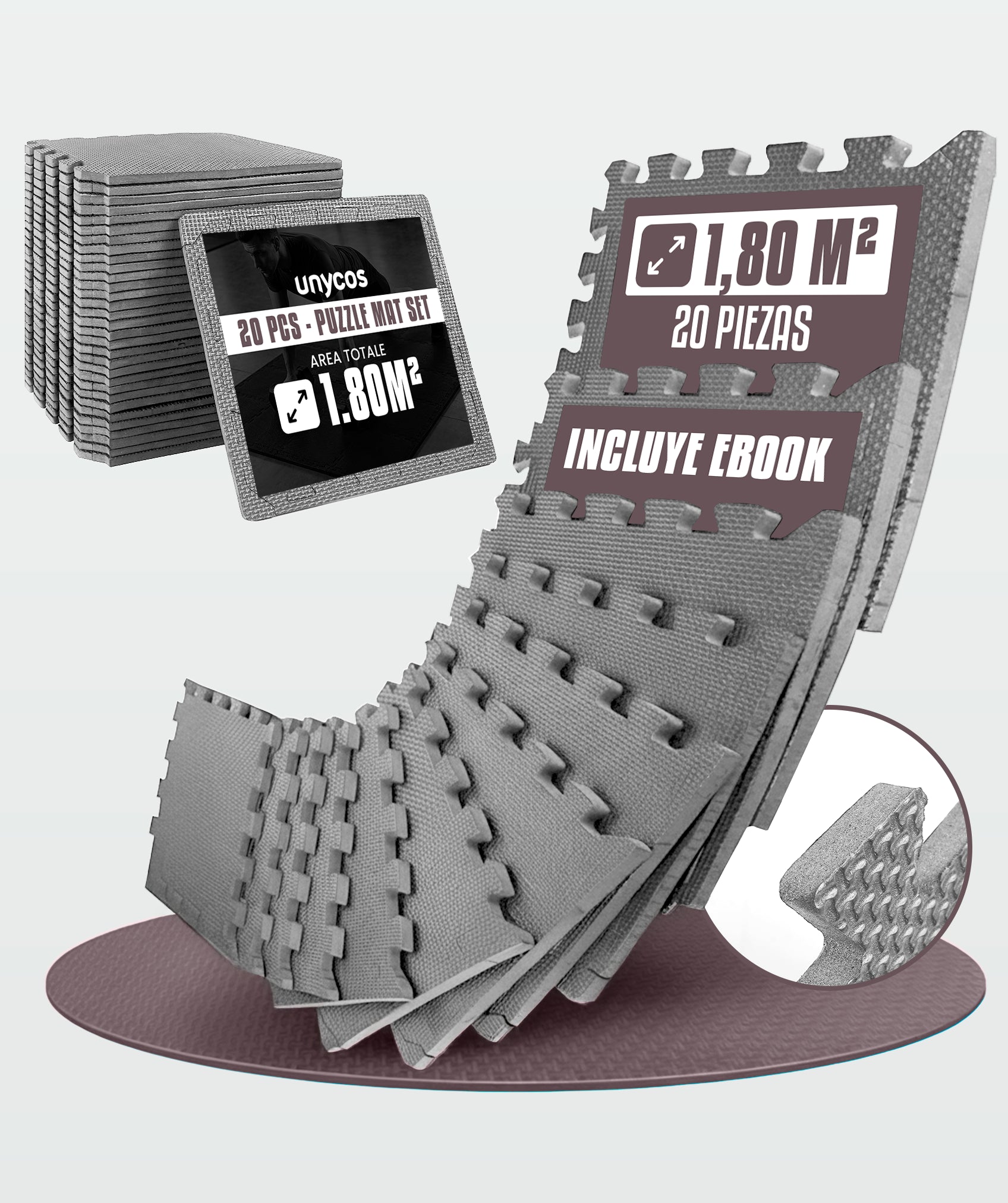 Cada pieza mide 30 x 30 x 1 cm y su diseño de puzzle permite una personalización práctica, adaptándose a cualquier tipo de suelo. La facilidad de ensamblaje las convierte en la elección perfecta para ajustarse a diversos espacios y necesidades. ¡Incluye e-Book con 50 ejercicios!