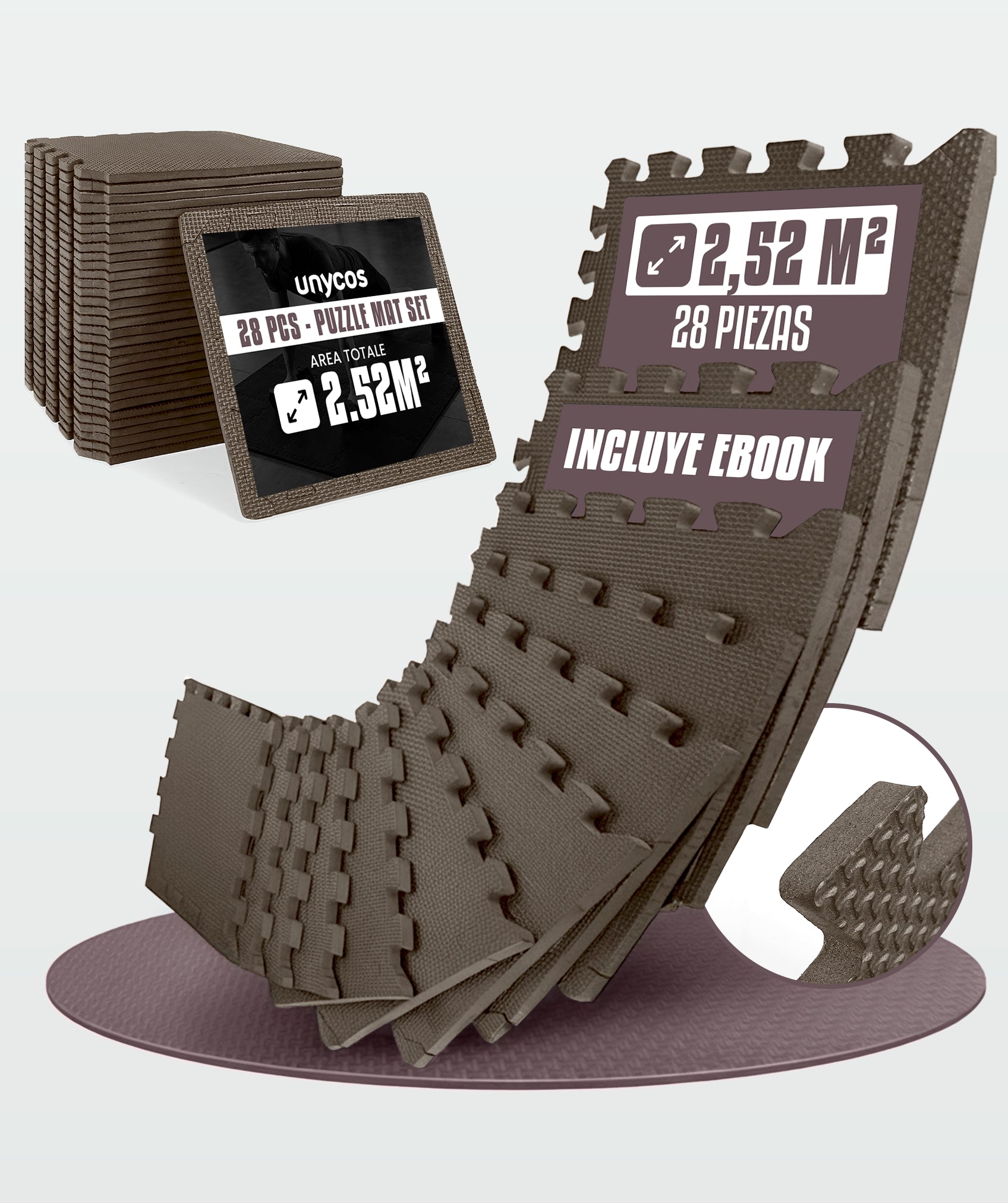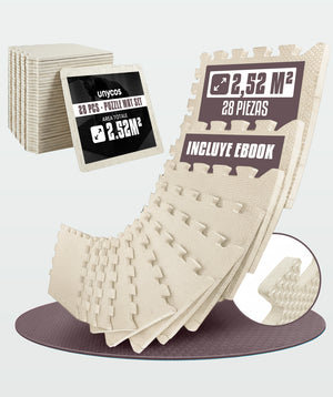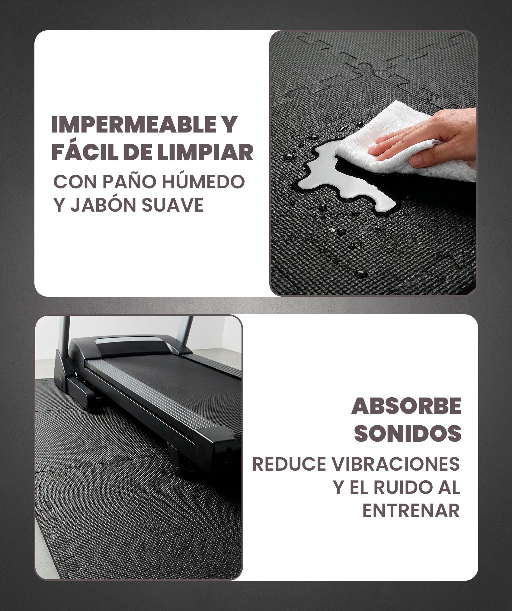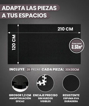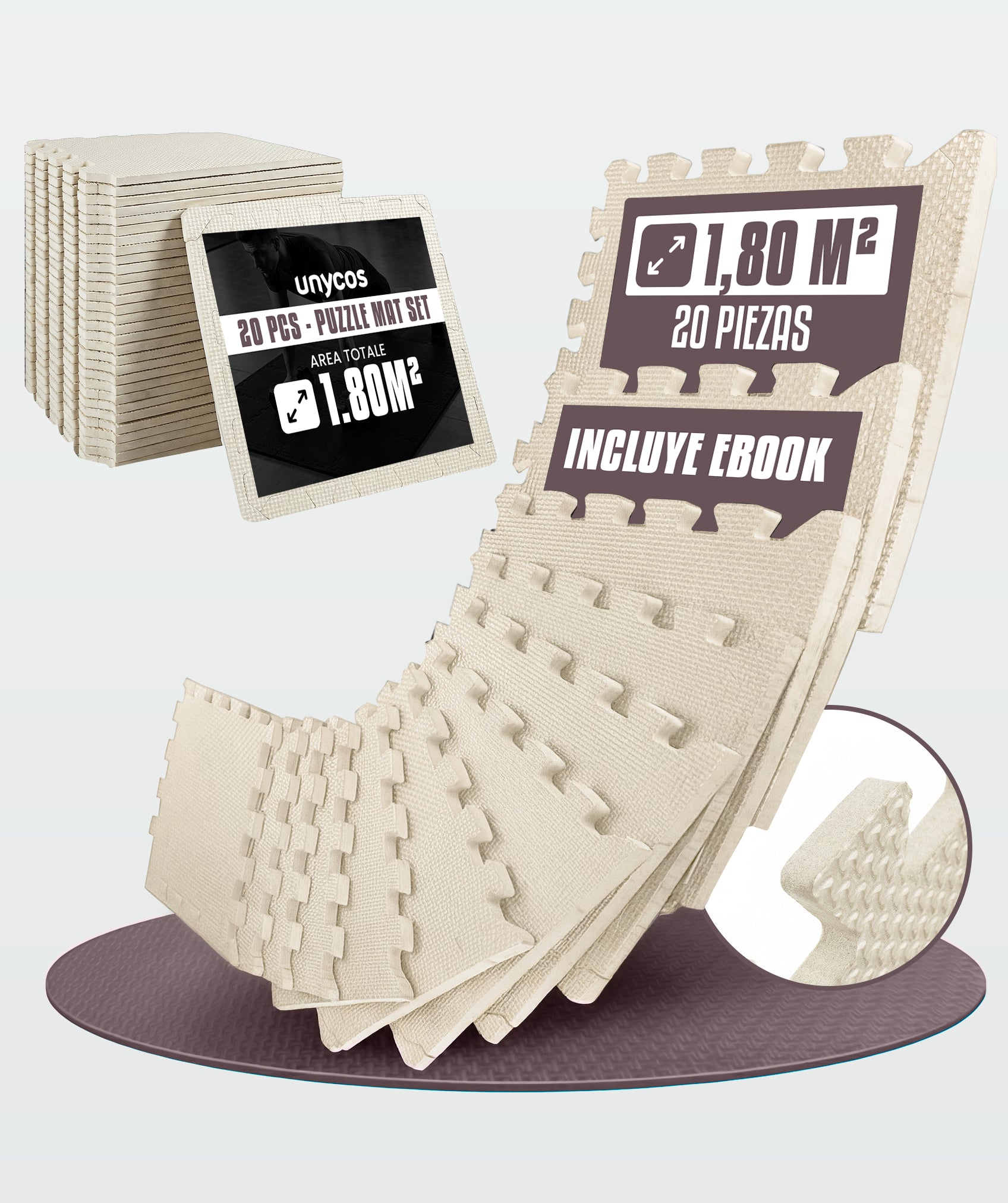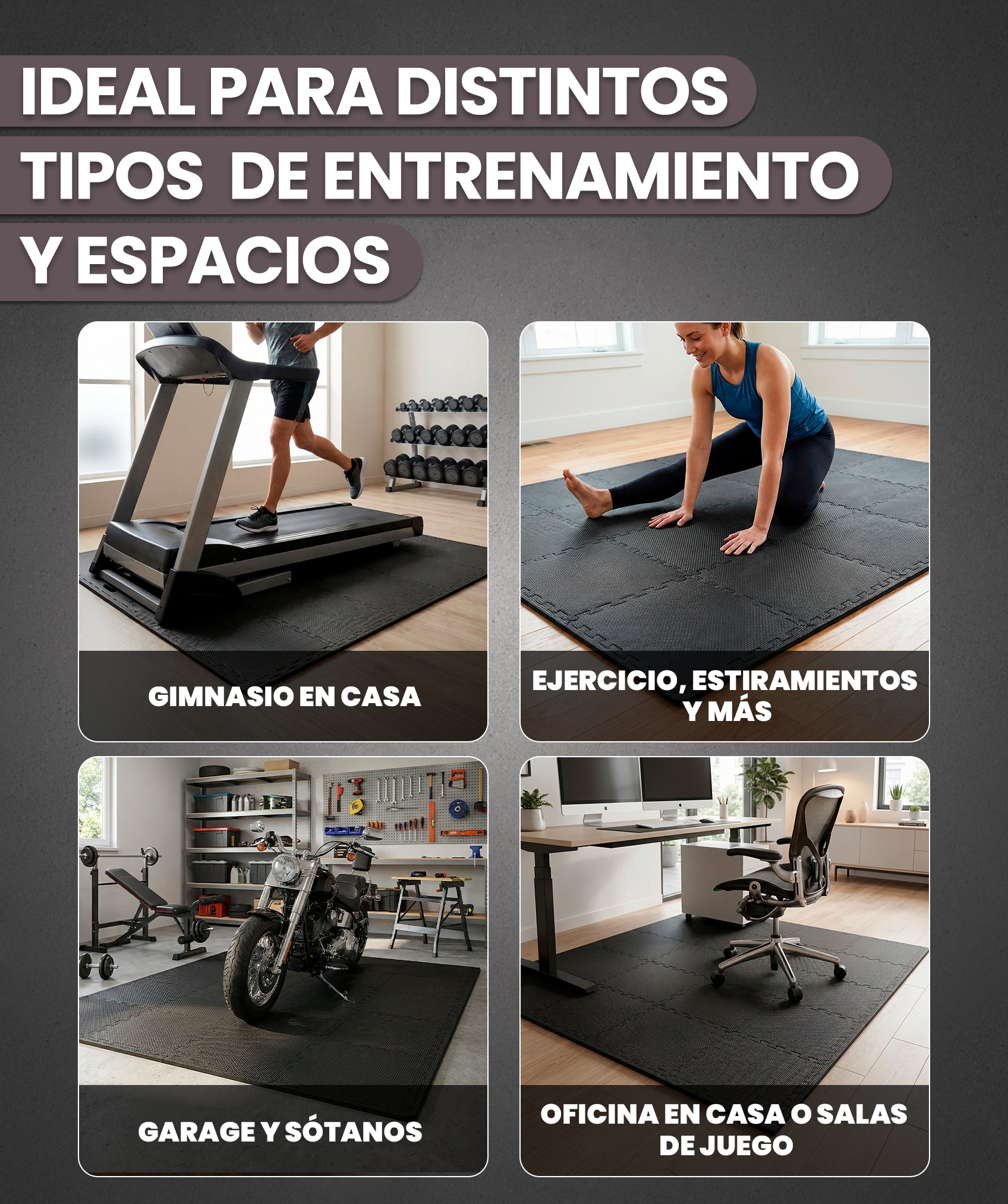 Cada pieza mide 30 x 30 x 1 cm y su diseño de puzzle permite una personalización práctica, adaptándose a cualquier tipo de suelo. La facilidad de ensamblaje las convierte en la elección perfecta para ajustarse a diversos espacios y necesidades. ¡Incluye e-Book con 50 ejercicios!