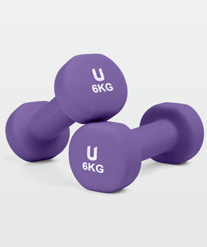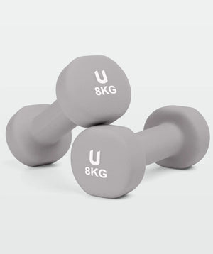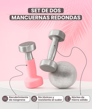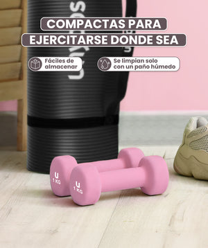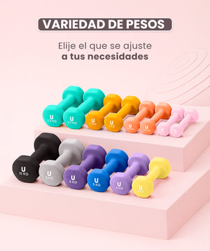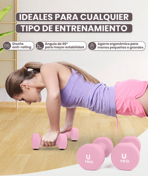Kit de mancuernas con recubrimiento de neopreno suave, inodoro, impermeable y con efecto antideslizante para prevenir caídas y facilitar el levantamiento.