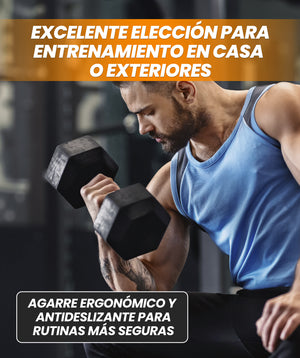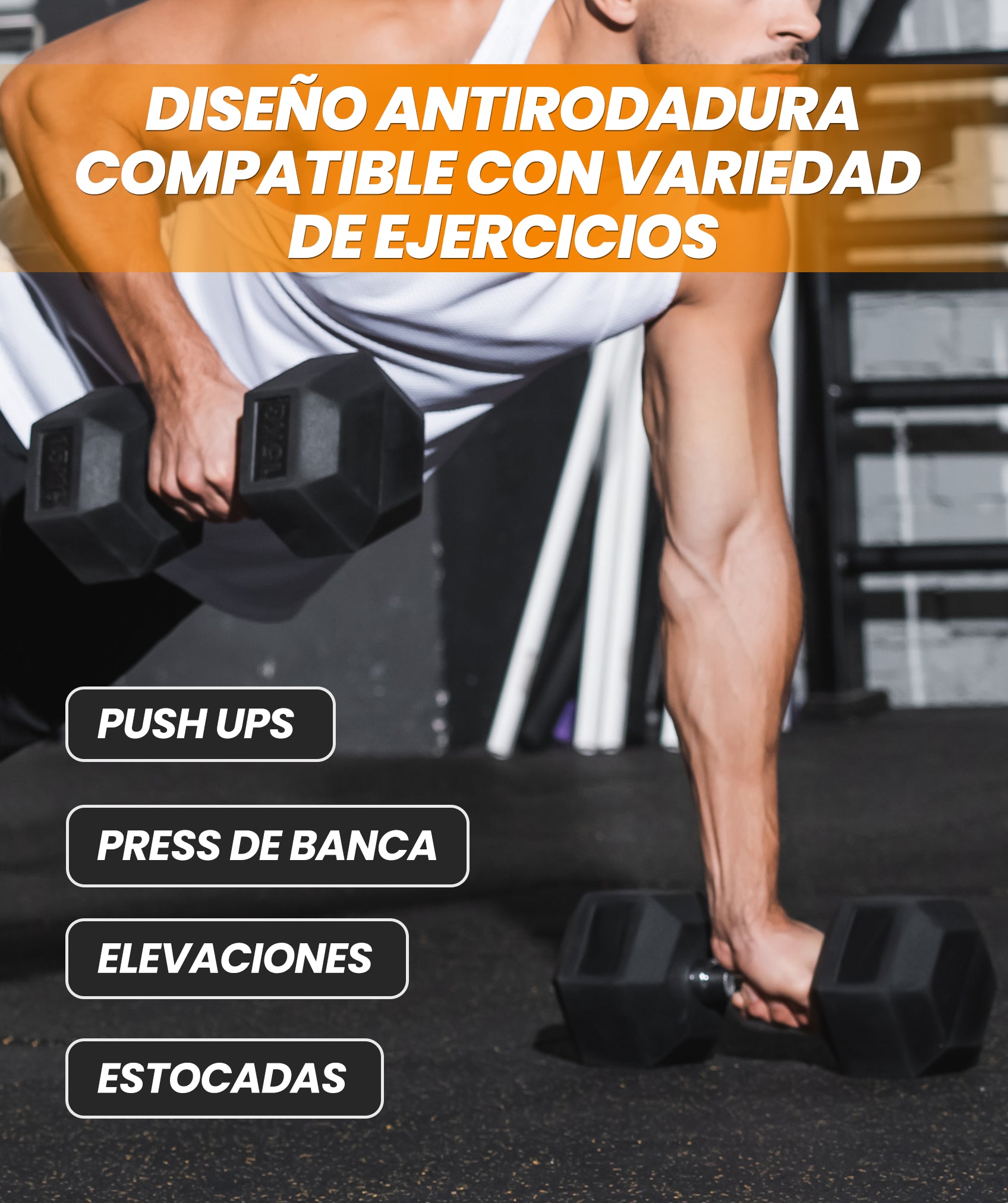Cuentan con cabezales de diseño hexagonal que estabilizan los ejercicios de apoyo, levantamiento y evitan accidentes por resbalones.