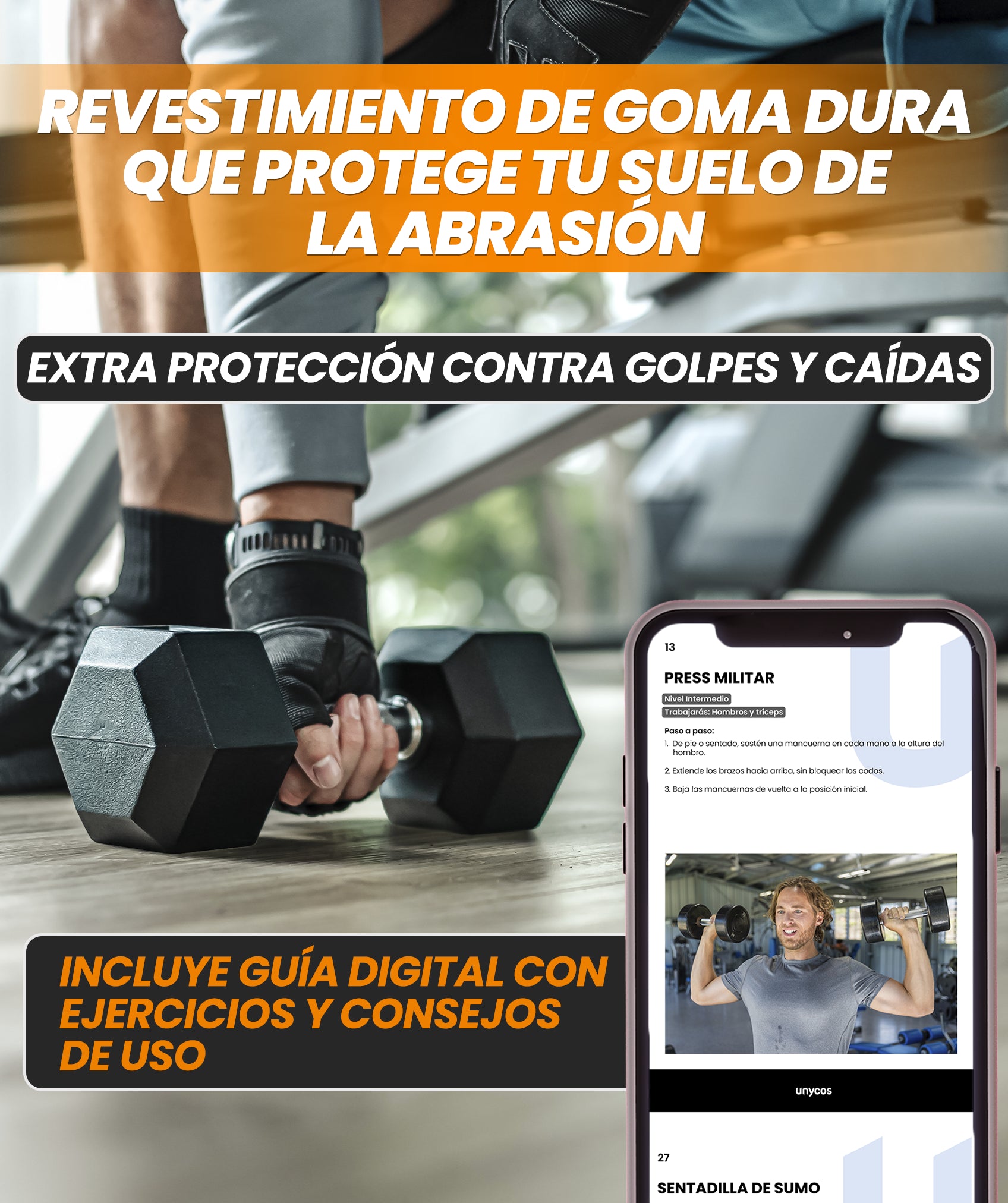 Las mancuernas cuentan con un núcleo de hierro y un revestimiento de goma dura que resiste golpes y caídas. Asimismo, no deterioran el suelo con el contacto directo.