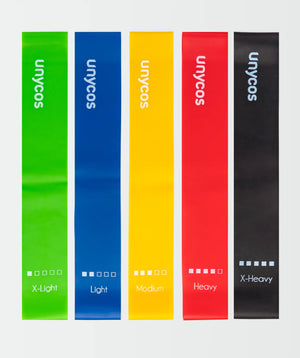 Set de 5 gomas elásticas fabricadas en látex, amigables con la piel para evitar alergias y sensación de ardor en las muñecas o tobillos al estirarlas. Presentan un agarre natural, cómodo y seguro que facilita la práctica de numerosos ejercicios sin riesgos de deslizamientos incómodos.