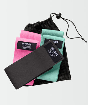 Estas bandas cuentan con medidas de 8 cm (la curva completa es de 36 cm) y ofrecen 3 niveles de resistencia: 20-30 lb (9 kg -14 kg; light | verde), 30-40 lb (14 kg-18 kg; medium | morado) y 40-50 lb (18 kg-23 kg; heavy | negro). De esta manera, proporcionan una tensión constante, sin deformarse después de largos estiramientos.